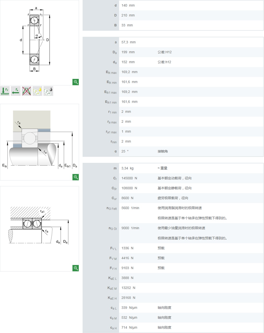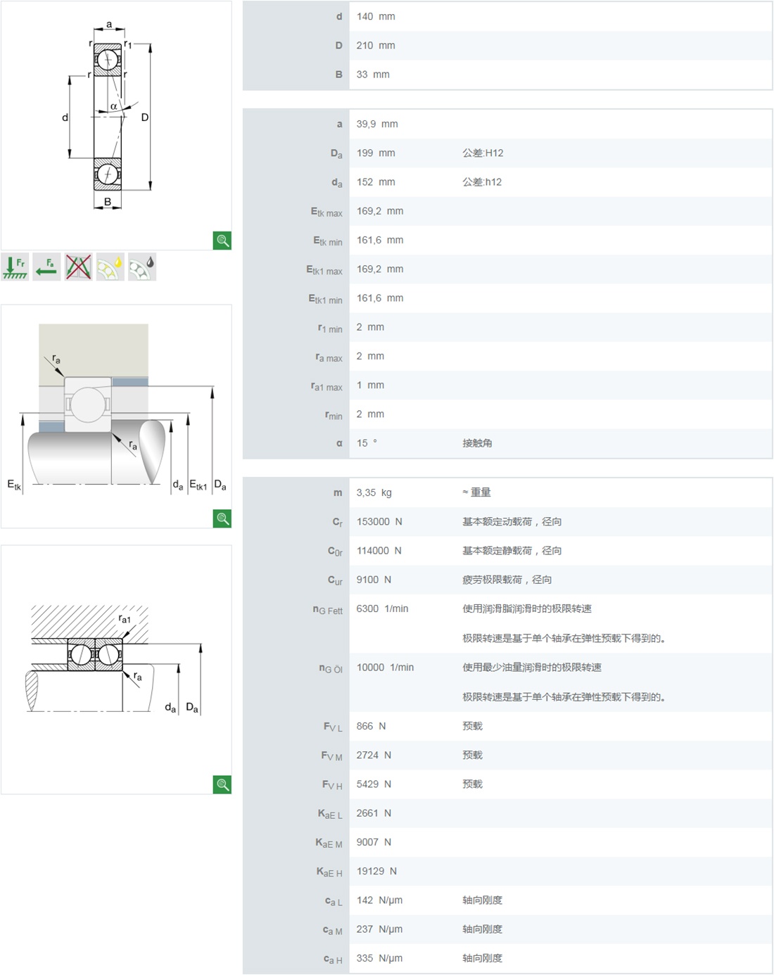 | 額定載荷(KN) Cr | 額定載荷(KN) Cor | 極限轉(zhuǎn)速(rpm) 脂潤滑 | 極限轉(zhuǎn)速(rpm) 油潤滑 | 額定載荷(KN) Cr | 額定載荷(KN) Cor | 極限轉(zhuǎn)速(rpm) 脂潤滑 | 極限轉(zhuǎn)速(rpm) 油潤滑 |